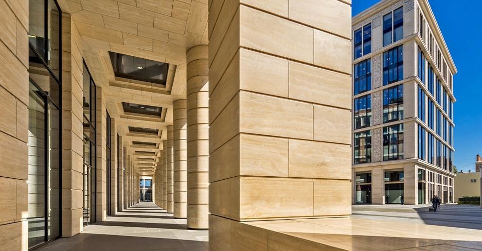 Фасады зданий выдержаны в стиле современной классики и построены на сочетании стекла и натурального камня Доломит Геналдон российского месторождения. Корпус 8 высотой в одиннадцать этажей выделяется своей эллиптической формой. Особенностью корпуса 9 высотой в девять этажей является атриум со стеклянной крышей и восемью панорамными лифтами.