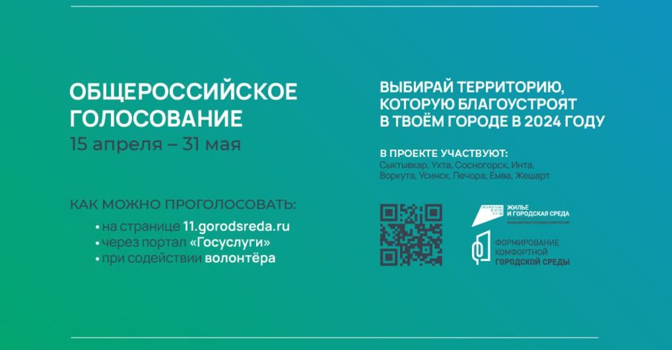 Напомним, голосование в этих муниципалитетах продлится до 31 мая. Проголосовать можно на сайте https://11.gorodsreda.ru/ или на портале «Госуслуги» (не через мобильное приложение): https://pos.gosuslugi.ru/lkp/fkgs/. Для этого необходимо авторизоваться на портале «Госуслуги», далее в личном кабинете пользователя на главной странице в разделе «Выскажите своё мнение» оставить свой голос за понравившийся объект.