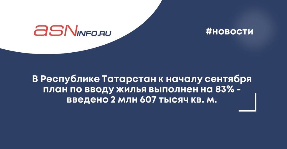 В Республике Татарстан к началу сентября план по вводу жилья выполнен на 83% - введено 2 млн 607 тысяч кв. м.