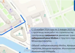 Со среды, 13 ноября 2024 года, в Петербурге закрывают проезд по набережной реки Мойки от Круглого переулка до Мошкова переулка, сообщили в государственной административно-технической инспекции.