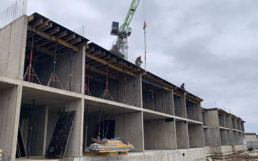 Работы по устройству фундамента завершены, на данный момент строители возводят второй этаж и прокладывают наружные сети.