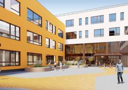 Архитектурное решение школы выполнено в минималистичном стиле с использованием простых прямоугольных форм. Цветовая гамма фасадов – контрастная, сочетающая белый, коричневый, бежевый, желтый и терракотовый цвета. В отделке будут использованы штукатурка, фиброцементные панели и другие современные материалы. Предусмотрена подсветка входных групп и декоративное освещение территории.