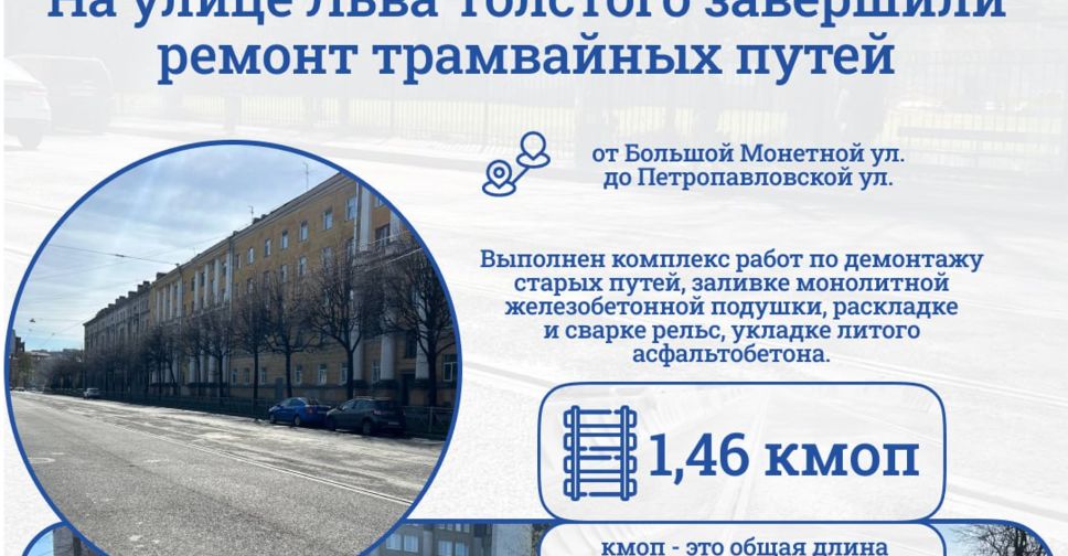 На улице Льва Толстого в Петроградском районе завершены ремонтные работы на трамвайных путях