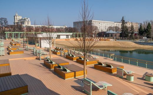 Вдоль берега оборудовали настилы. Для этого на сваях смонтировали металлический каркас с покрытием из террасной доски площадью почти 4,6 тысячи квадратных метров. На настилах разместили разнообразные кресла, шезлонги и лежаки для отдыха и солнечных ванн. Вокруг пруда установили также лавочки и урны. В общей сложности появилось 356 малых архитектурных форм.