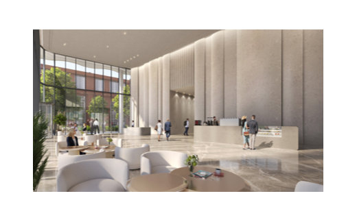 Во входной группе предусмотрены зоны для ожидания и деловых встреч. В здании установят семь пассажирских лифтов и один грузовой – для технических нужд.