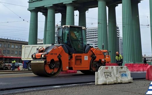 На участке Московского проспекта от Кузнецовской улицы до Лиговского проспекта подрядная организация выполняет работы укладке асфальтобетонного покрытия.