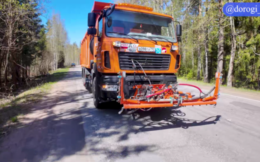 Здесь дорожники заделывали ямы смесью битумной эмульсии с щебнем. Процесс ремонта прост, но эффективен: сначала подготавливается сама смесь, а потом заливается в яму. После застывания она становится ровной и устойчивой к нагрузкам.