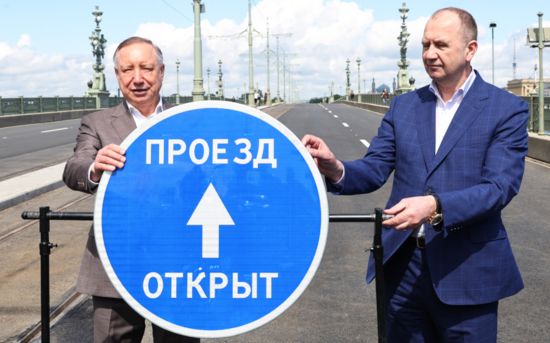 Первым по новым трамвайным рельсам пустили туристический трамвай. Губернатор подчеркнул, что для удобства горожан ремонт одной из центральных переправ через Неву завершили на 4 месяца раньше срока.