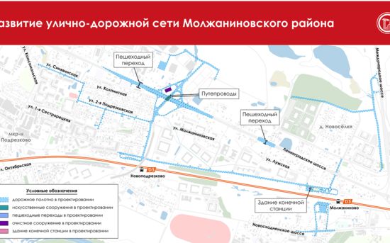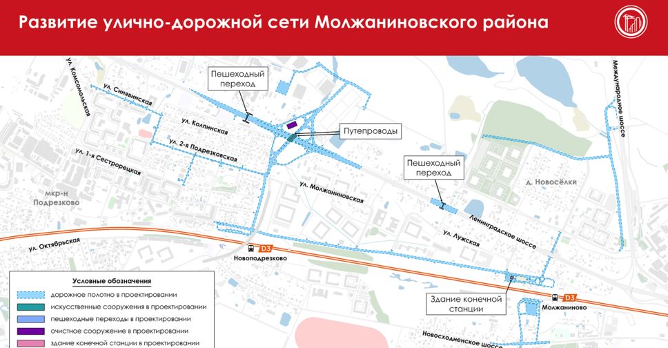 - строительство улицы вдоль северо-восточной стороны Октябрьской железной дороги от остановочного пункта Новоподрезково до Молжаниново;