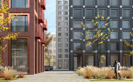 Фасады изготовлены из ригельной бетонной плитки, имитирующей клинкерный кирпич – отсылка к дореволюционному промышленному наследию места. Колористика корпусов проекта гармонично перекликается с цветами знаменитого Будёновского жилого массива.