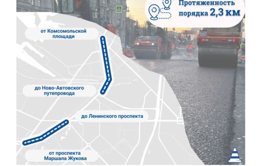 Работы пройдут на участках от Комсомольской площади до Ново-Автовского путепровода и от Ленинского проспекта до проспекта Маршала Жукова общей протяженностью порядка 2,3 км.