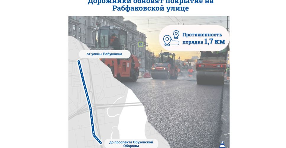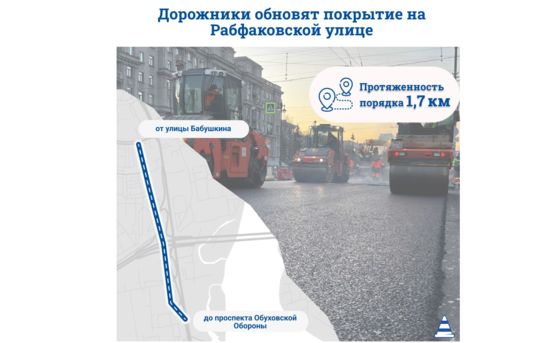 В связи с производством работ по ремонту дорожного покрытия с 21 июля по 5 августа 2025 года ограничивается движение транспорта по Рабфаковской улице от улицы Бабушкина до проспекта Обуховской Обороны.