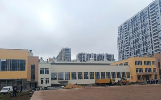 Похожая ситуация и на стройке школы в жилом комплексе "Октябрьская набережная", которую возводит ООО "ЛСР. Недвижимость-СЗ". Здесь объект рассчитан на 825 мест. Сейчас на площадке также завершаются отделочные работы и работы по благоустройству.