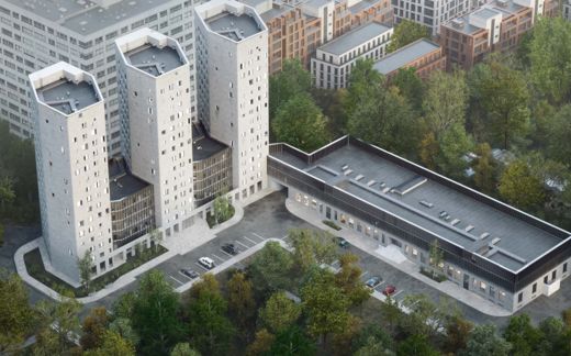 «Корпус А получит сложную геометрическую форму – пятиэтажная часть здания между тремя башнями будет заглублена внутрь на три метра и иметь скошенные края. Основной архитектурный прием на башнях – хаотичное расположение квадратных окон разных размеров и с разной степенью заглубления. Малоэтажные секции корпусов А и Б, наоборот, будут отличаться четкой модульной сеткой окон», – отметил Сергей Кузнецов.