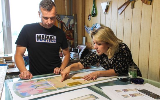 На фото, как уточняется, процесс создания витража с магнолией для двери дома № 9.