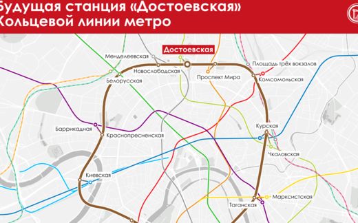 Мэр напомнил, что «Достоевская» расположится между «Проспектом Мира» и «Новослободской». Она станет 13-й станцией Кольцевой линии метро и будет иметь пересадку на Люблинско-Дмитровскую ветку.