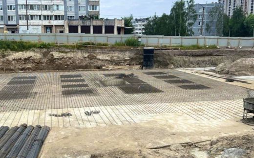 Сейчас на площадке строители готовят котлован, заливают подготовительный слой бетона и устанавливают арматуру для укрепления фундамента. Параллельно с этим со стройплощадки выносятся водопроводные и канализационные трубы.