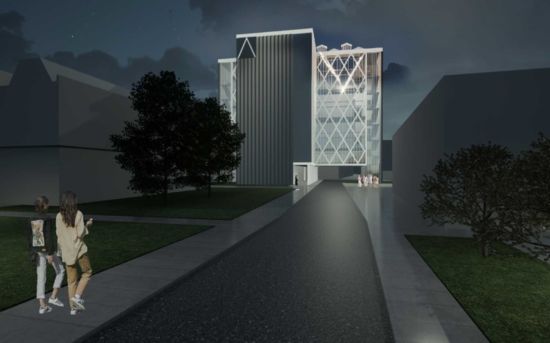 Фасады будут отделаны архитектурным бетоном в светлых тонах. На торцах здания предусмотрено декоративное оформление в виде треугольных ячеек, создающих выразительный светотеневой эффект.
