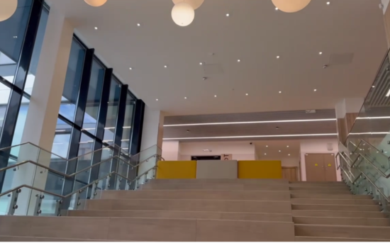 Для детей там создано комфортное пространство с большим холлом и амфитеатром, кабинетом робототехники, медиатекой, актовым залом на 760 человек, школьным двором с теплицей, метеостанцией и спортивной площадкой.