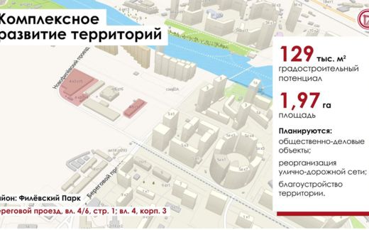 Участки находятся по адресу: Береговой проезд, вл. 4/6, стр. 1 и вл. 4, корп. 3. Здесь можно будет построить 129 тыс. кв. м недвижимости.