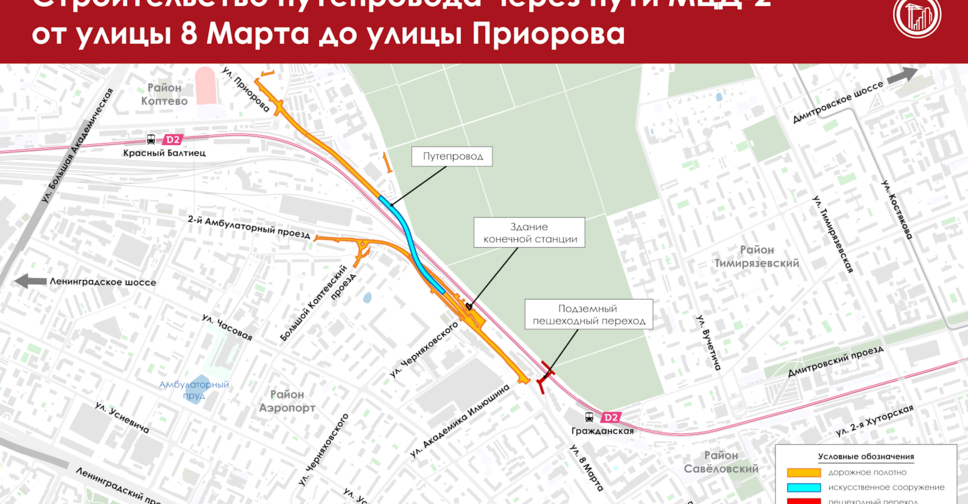 В створе ул. Академика Ильюшина появится подземный переход длиной 70 м, который обеспечит безопасный доступ пешеходов к Тимирязевскому парку и станции МЦД-2 Гражданская.