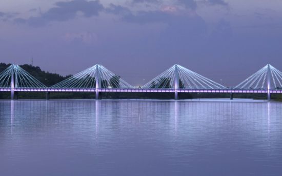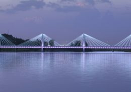 В Красноярске разработали эскиз велопешеходного моста на остров Татышев. Переправа будет навесной, что придаст ей лёгкость и невесомость. Сочетание серого и светлого бежевого цветов создаст эффект «парения» створа в воздухе. Пролёт будет выполнен из сталежелезобетона.