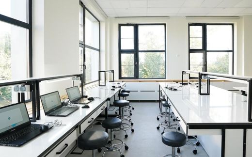 Третий этаж занимают специализированные учебные кабинеты, кабинеты основ и принципов программирования. А четвертый этаж — робокласс и инженерный лабораторно-исследовательский комплекс с зонами конструирования, моделирования и физических экспериментов. Кроме того, есть ИТ-полигон с местами для программирования, пилотирования БПЛА, разработки и испытания устройств, а также обработки материалов.