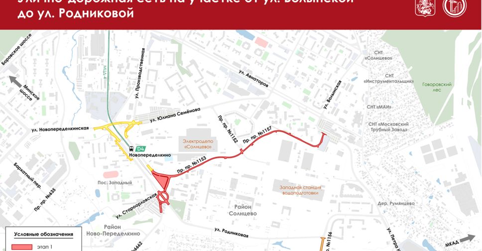 «На втором этапе реконструируем железнодорожный переезд у станции МЦД-4 Новопеределкино, на стыке ул. Юлиана Семёнова и Новопеределкинской. На третьем – обновим Проектируемый проезд № 1156 в квартале № 32 в Солнцеве для создания удобного выезда на ул. Родниковую», – уточнил Сергей Собянин в своем телеграм-канале.