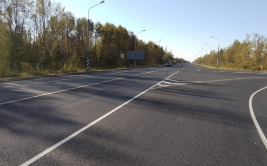 На участке от границы Великого Новгорода до поворота на деревню Богданово дорожниками выполнены работы по восстановлению выравнивающего и верхнего слоев асфальтобетонного покрытия, произведена планировка и досыпка обочин, а также нанесена разметка термопластиком.