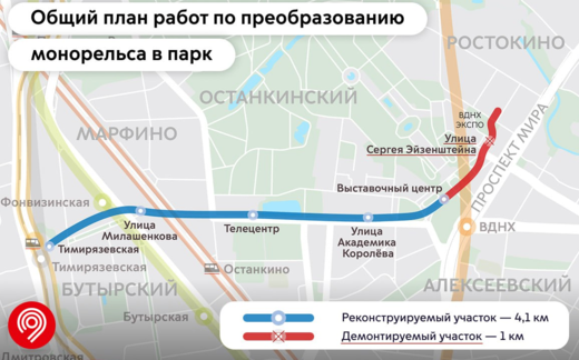 Это будет первый в России круглогодичный прогулочный парк на высоте 6 метров. Территория свяжет пять районов — Останкинский, Алексеевский, Тимирязевский, Марфино и Бутырский, где проживают больше 300 тысяч человек.