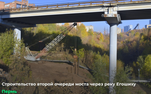 В краевой столице началось строительство второй очереди моста через реку Егошиху. Первую очередь моста, который соединяет Свердловский и Мотовилихинский районы Перми, построили в 2004 году. Сейчас по нему ежедневно проезжают более 40 тысяч машин. Строительство второй очереди поможет разгрузить действующий мост.