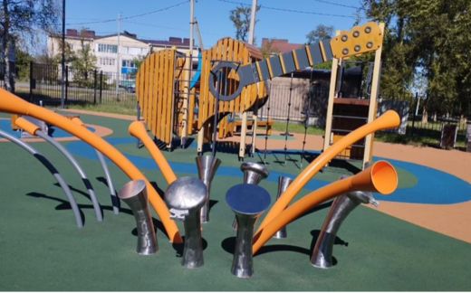 «Музыкальный» дизайн обеспечили за счет установки тематического оборудования. В частности, на площадке появился арт-объект «Трубы». Кроме этого, установлен игровой комплекс «Гитара» производства компании «АВЕН». Попасть внутрь музыкального инструмента пятиметровой длины можно по нескольким сеткам и лестницам или по скалодрому. Для спуска предусмотрена скатная горка.