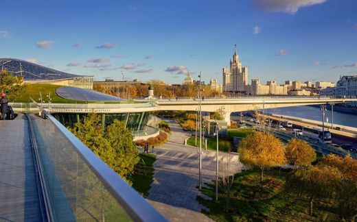 Парящий мост в парке «Зарядье» — один из самых известных пешеходных мостов в столице, уникальная смотровая площадка, возвышающаяся над Москвой-рекой без единой опоры. С моста можно увидеть собор Покрова Пресвятой Богородицы на Рву, Спасскую башню Кремля, а также высотку на Котельнической набережной.