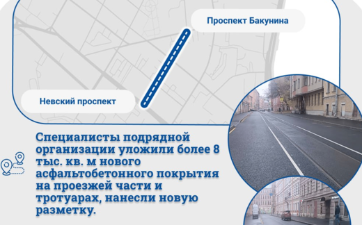Здесь обновили более 8 тыс. кв. м асфальтобетонного покрытия. В межрельсовом пространстве трамвайных путей был уложен литой асфальт, который самостоятельно набирает прочность.