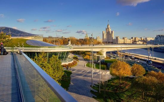 Парящий мост в парке «Зарядье» — один из самых известных пешеходных мостов в столице, уникальная смотровая площадка, возвышающаяся над Москвой-рекой без единой опоры. С моста можно увидеть собор Покрова Пресвятой Богородицы на Рву, Спасскую башню Кремля, а также высотку на Котельнической набережной.