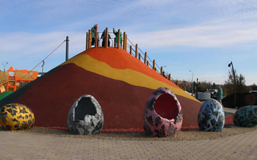 В городе Шарыпово завершается обустройство Динопарка. Бывший городской пустырь наполнили реалистичными фигурами динозавров, создали арт-объекты. Горку выполнили в виде потухшего вулкана, детский игровой комплекс получился в форме стегозавра.