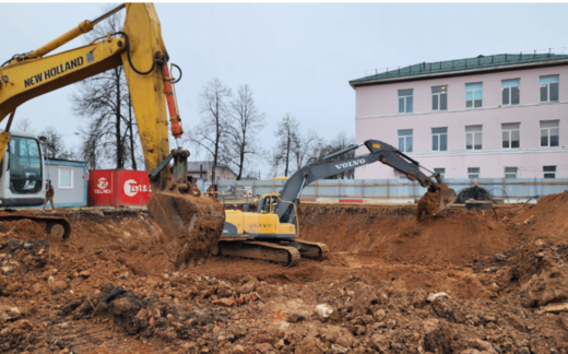 По словам заместителя начальника участка Дениса Чалова, на данном этапе идёт устройство котлована под фундаментную плиту для строительства трёхэтажного здания.