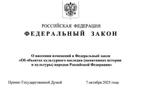 Опубликован Федеральный закон № 374-ФЗ от 15.10.2025 «О внесении изменений в Федеральный закон «Об объектах культурного наследия (памятниках истории и культуры) народов Российской Федерации».