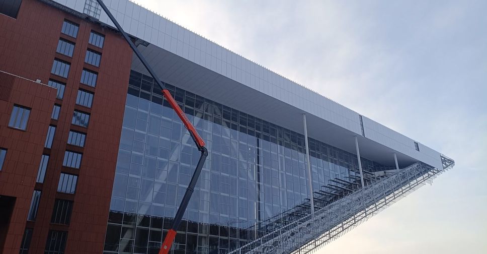 Самый крупный витраж напоминает по форме стеклянный парус. Его общая площадь – порядка 1,7 тыс. кв. м, что сравнимо с площадью четырёх профессиональных баскетбольных площадок. Конструкция собрана из 242 двухкамерных стеклопакетов, которые обеспечивают максимальную энергоэффективность, повышенную безопасность и светопропускаемость. Общая масса витража превышает 170 т. Параллельно завершены работы по устройству и отделке второго витража общей площадью 620 кв. м, который открывает вид на реку Преголю.