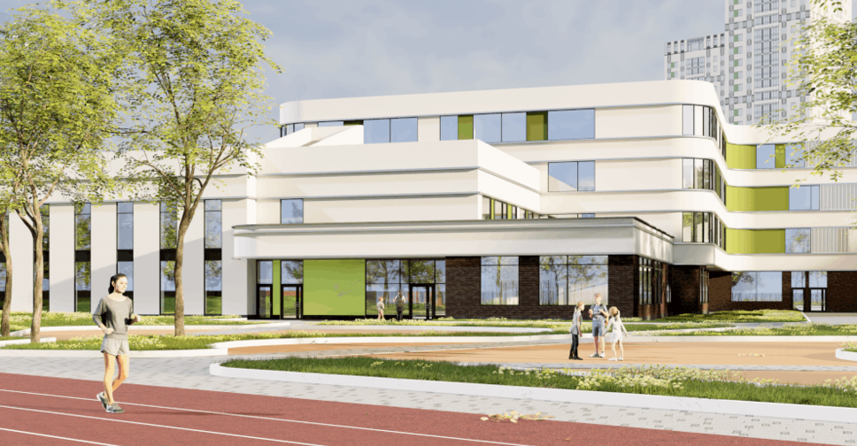 На прилегающей территории появится полноценная спортивная и рекреационная инфраструктура: футбольное поле, универсальные площадки для баскетбола и волейбола, беговые дорожки, зоны для прыжков в длину, а также площадки для активного и спокойного отдыха учащихся. Перед главным входом предусмотрено общественное пространство для мероприятий.