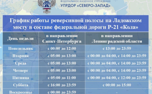 В связи с планово-предупредительными работами на Ладожском мосту (40-й км трассы Р-21 «Кола», Кировский район) с 28 марта вводится дополнительная (третья) полоса в реверсивном режиме. Это позволит сохранить пропускную способность в часы пик. На мосту установят временные знаки, водоналивные барьеры и светофоры. Пожалуйста, планируйте свой маршрут заранее и соблюдайте скоростной режим.