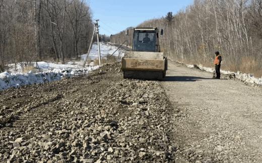 Основные работы на объекте – земляные. Идет формирование «дорожного корыта» для будущей дороги. Грунт вынимается, готовится основание, а после вновь засыпается и плотно трамбуется.