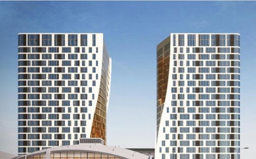 Две 21-этажные башни со сложной геометрией объединит высокий шестиметровый стилобат. Фасадные конструкции типовых этажей представляют собой навесной вентилируемый фасад. Часть стен между оконными проемами облицуют керамогранитом с рисунком, напоминающим текстуру светлого камня, другую часть оформят с градиентным паттерном. На торцах установят стемалитные панели. Внешние блоки кондиционеров скроют в интегрированных нишах, не нарушая архитектурную эстетику.