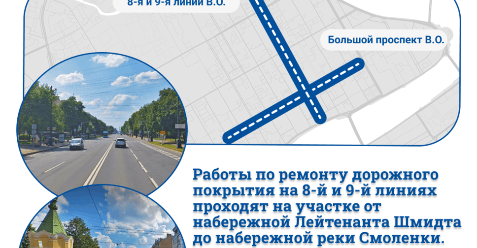 Помимо этого, в рамках нацпроекта «Инфраструктура для жизни» ведутся работы по ремонту Большого проспекта В. О. на участке от 1-й до 23-й линий протяженностью более 1,5 км.