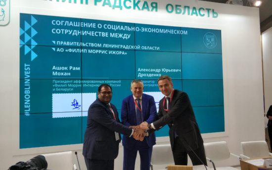 Соответствующее соглашение о сотрудничестве в рамках Российского инвестиционного форума подписали губернатор Ленинградской области Александр Дрозденко и президент аффилированных компаний «Филип Моррис Интернэшнл» в России и Беларуси Ашок Рам Мохан.