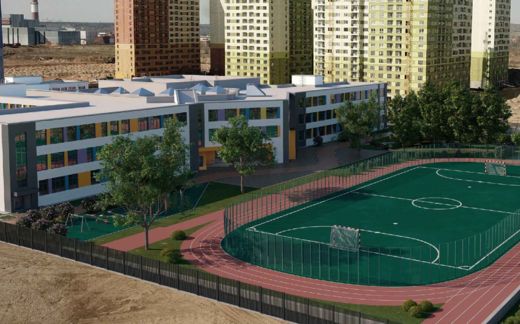 Поскольку школу возведут в окружении жилой застройки, проектом предусмотрены активные пешеходные связи с близлежащими домами. На прилегающем участке предусмотрен большой спортивный сектор со стадионом, а также озелененные зоны отдыха.