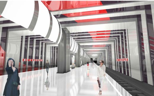 «Пространство станции сформировано чередованием матовых несущих рам и глянцевых поверхностей стен и потолка. Архитектурный светильник пронизывает платформенную часть насквозь, зрительно опираясь на колонны. Динамику конструкции придают металлические «кольца» и цветовые акценты на потолке. Прием очень интересный, поскольку для столичного метро – редкость, когда облик всей станции строится на одной детали», - пояснил Сергей Кузнецов.